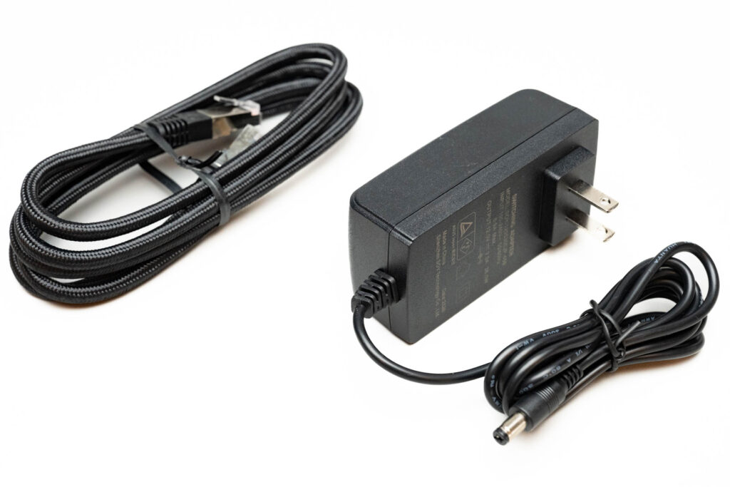 付属品はマニュアルなどの紙類を除くと、ACアダプタとLANケーブル。