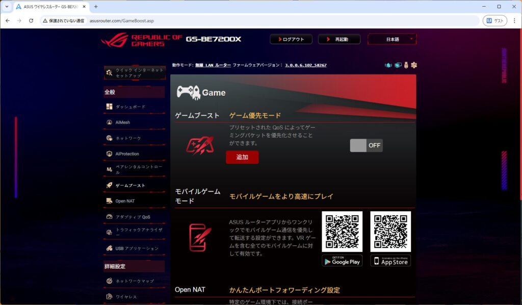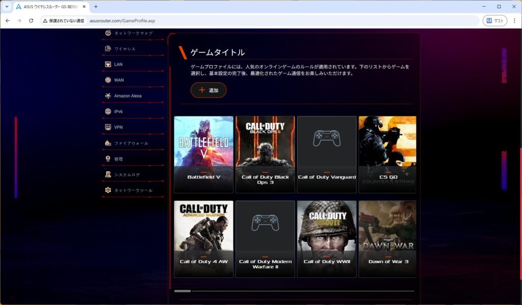 QoS自体は他社のルーターにも存在する機能ですが、GS-BE7200X(というよりASUSのROGブランドのルーター)では、多くのゲームタイトルの情報が元々プリセットされているので、オンラインゲームの通信を優先して快適に行えるよう、ワンタッチで設定できるのは本機の強みです。