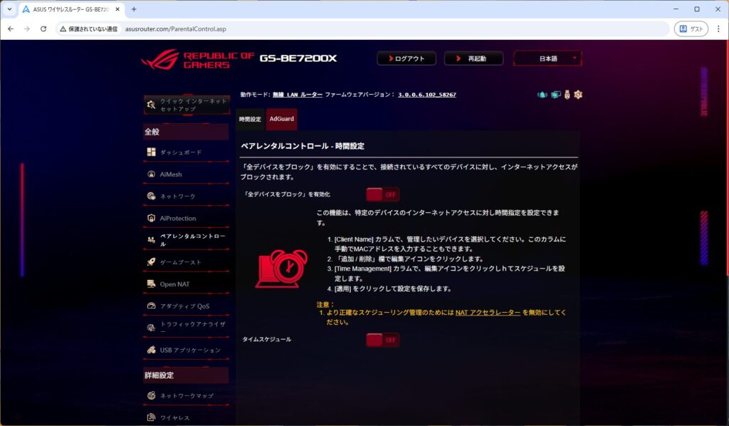 そんなときは「ペアレンタルコントロール」を有効にすることで、曜日や時間を指定してインターネットへの接続を遮断することもできます。