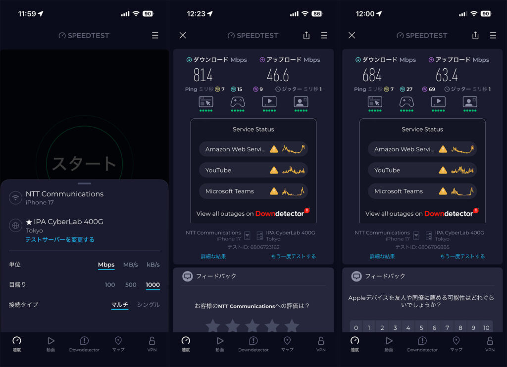 そこで「iPhone 17を、GS-BE7200Xと、現在使っているWXR-5950AX12(最大3.7Gbps)に繋ぎ、1Gbpsの回線で速度を測定」と「Wi-Fi 6(最大2.4Gbps)まで対応したノートPCを、10Gbpsの回線に繋いだGS-BE7200Xに接続し速度を測定」で計測を行いました。