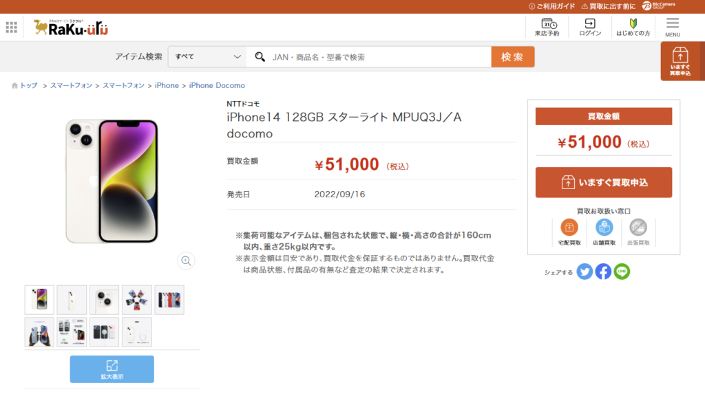 買取価格はだいたい相場で5~6万円くらいのようで、今回購入したiPhone 17の半額近くをiPhone 14の買取分で回収できそうです。