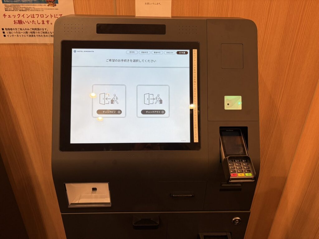 全国チェーンのビジネスホテルなどではおなじみの仕組みですので、こうしたチェックイン方法に慣れているのであれば有人フロントを使わずに、こちらでチェックインを済ませてしまったほうが楽・早いはず。