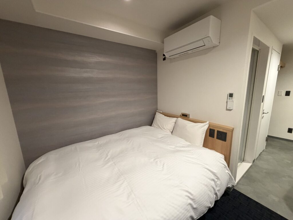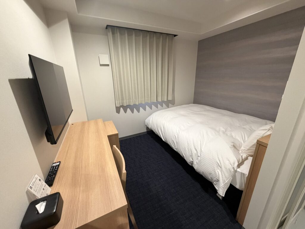 部屋サイズは約15㎡。140cm幅のダブルベッドと、いわゆる「一般的なビジホ」のレイアウト。