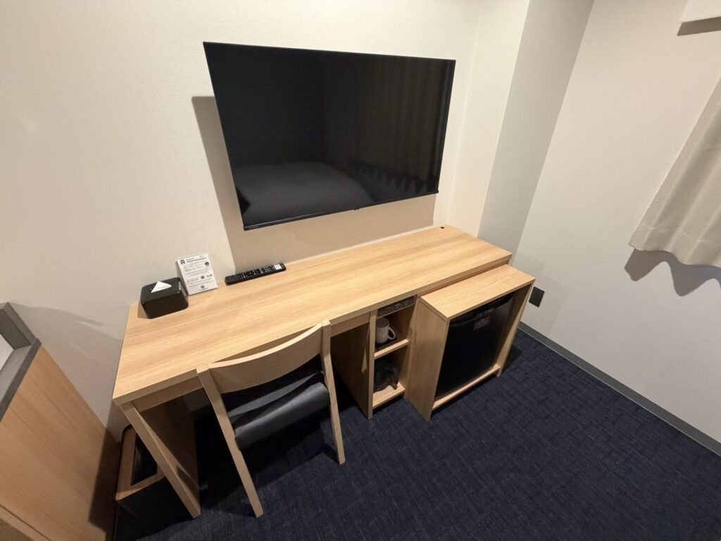 ただ、都心のホテルと比べるとだいぶ広く、例えばテーブルを使うのに椅子を後ろに引いてもベッドに当たるようなこともありません。