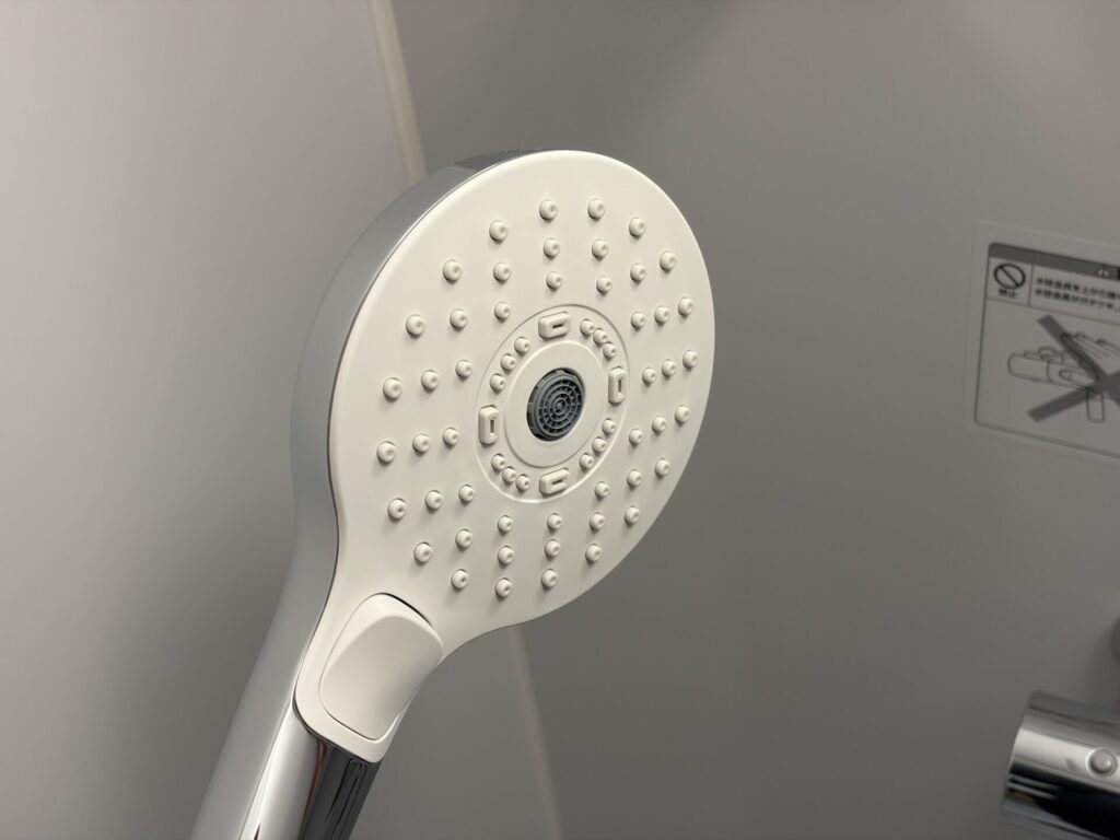 シャワーブースは奥行があり結構広く、部屋も大浴場も、シャワーヘッドは水流を変更できるタイプ。