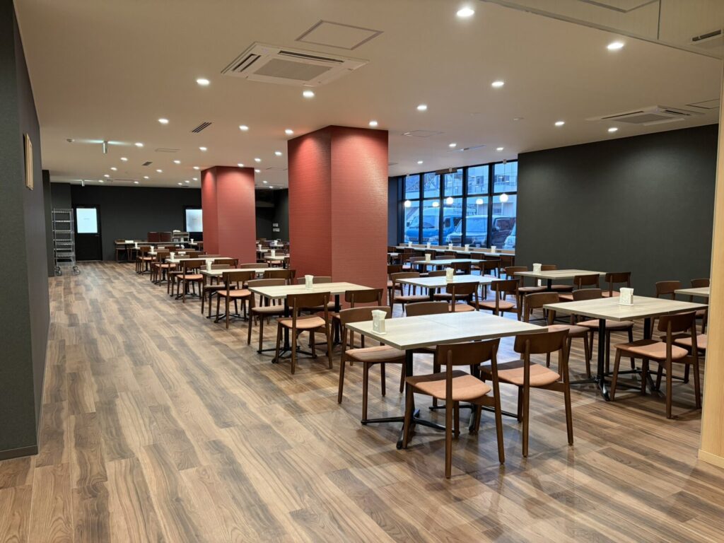 1Fには朝食会場があり、4人掛けのテーブルを中心に広くスペースが取られています。