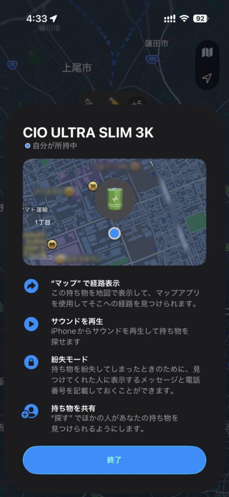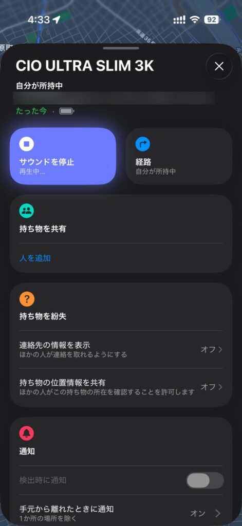 こんな感じでAppleデバイスやAirTag同様に「探す」上でどこにあるか確認することができます。サウンドを鳴らすこともできます。