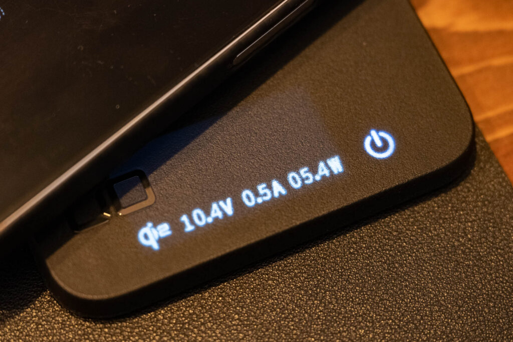 スマートフォンへのワイヤレス充電中はスタンド側の表示もQi2ロゴを表示し、出力状態も表示されるなどガジェット感満載。