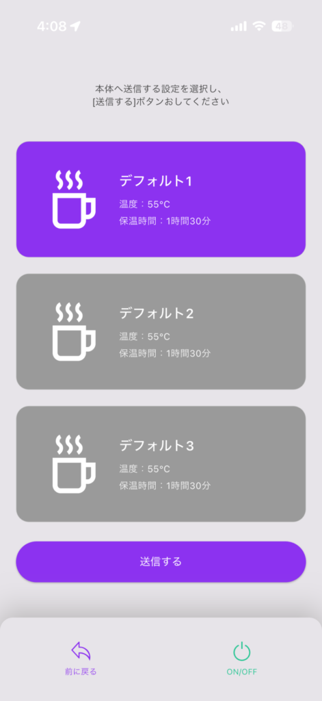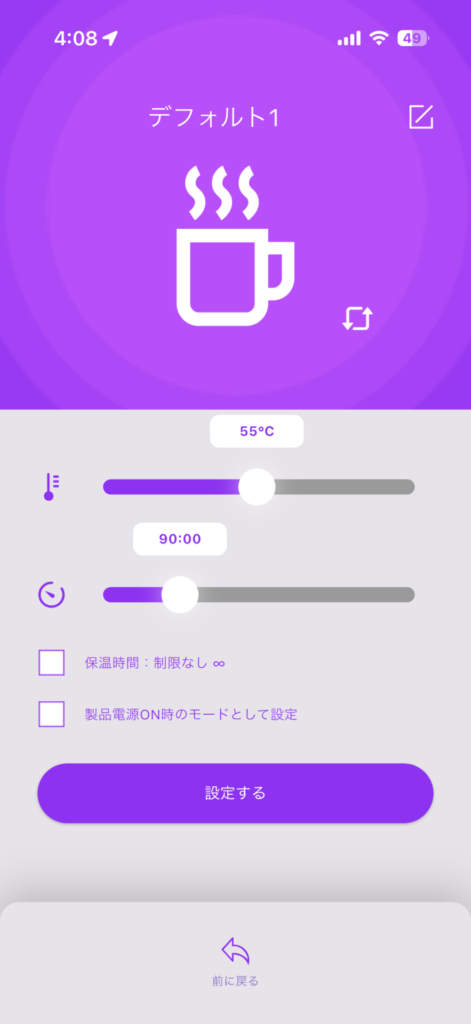 アプリで設定できるのは温度と保温時間で、これもいくつかプリセットを作ってサクッと切り替えることが可能です。