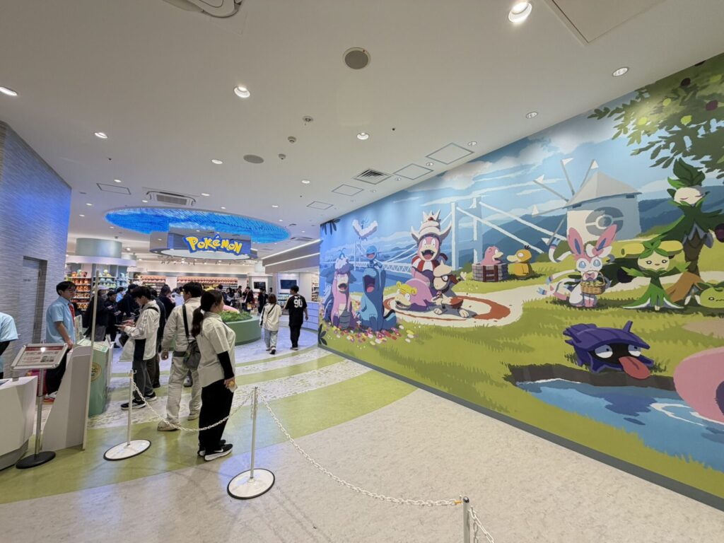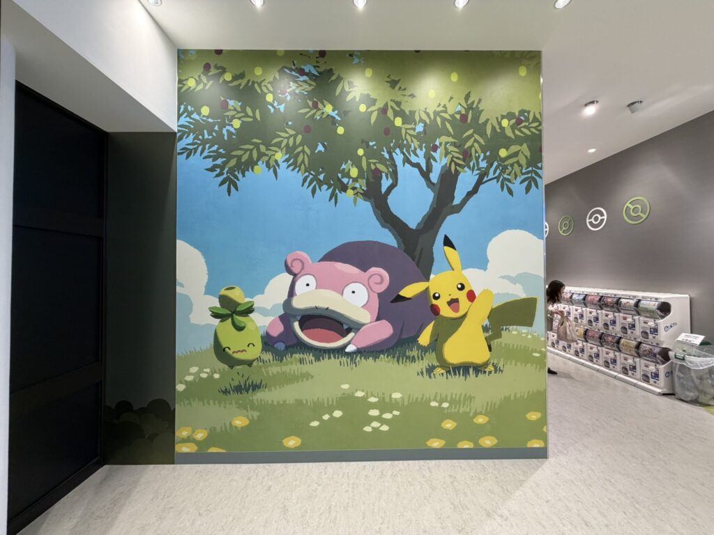店内は入ってすぐ、ポケモンセンターカガワの限定グッズにもあしらわれているキービジュアルが壁面いっぱいに貼られフォトスポットになっています。