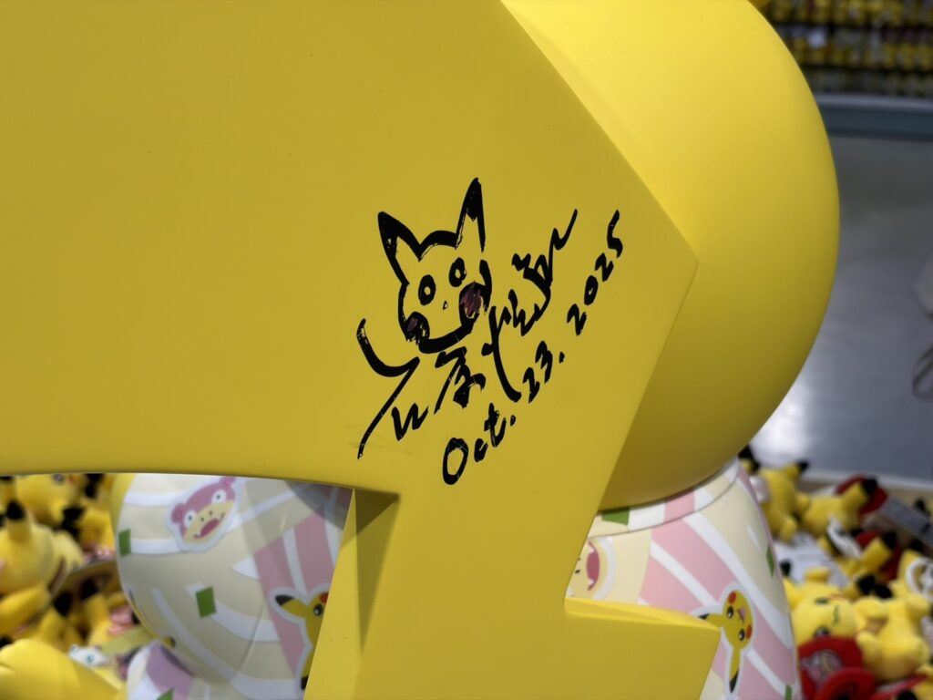 うどんを持った(持たされた)ピカチュウのしっぽには株式会社ポケモンの石原社長のサインがあり、ヤドンの背中にはポケモンシリーズのBGMなどを作曲している増田氏のサインがあります。